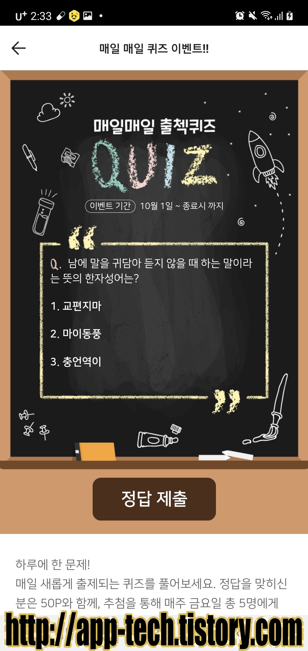 [앱테크] 하이타이, 매일매일 퀴즈 이벤트!! 3월 7일 정답!! (0) | 2021.03.07 |