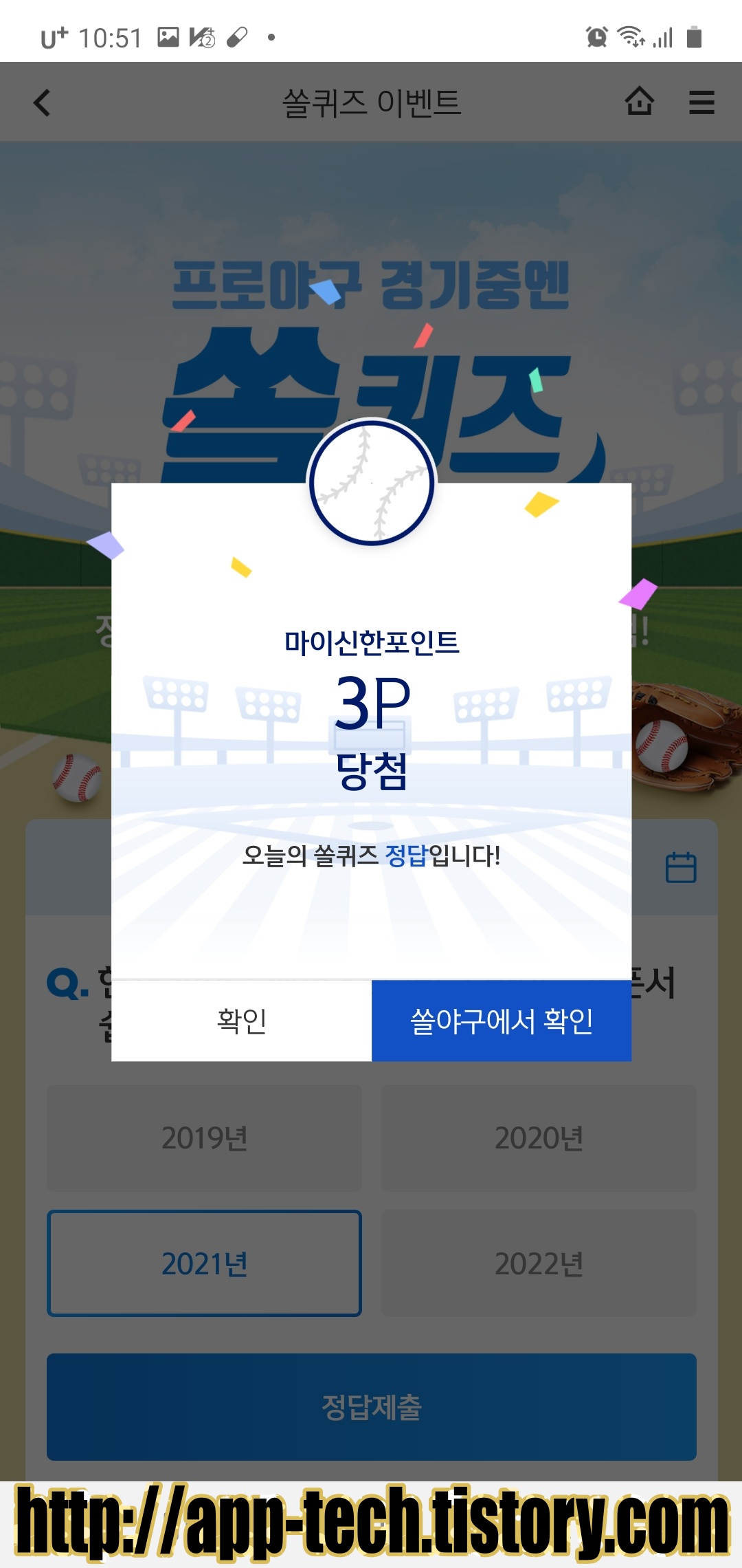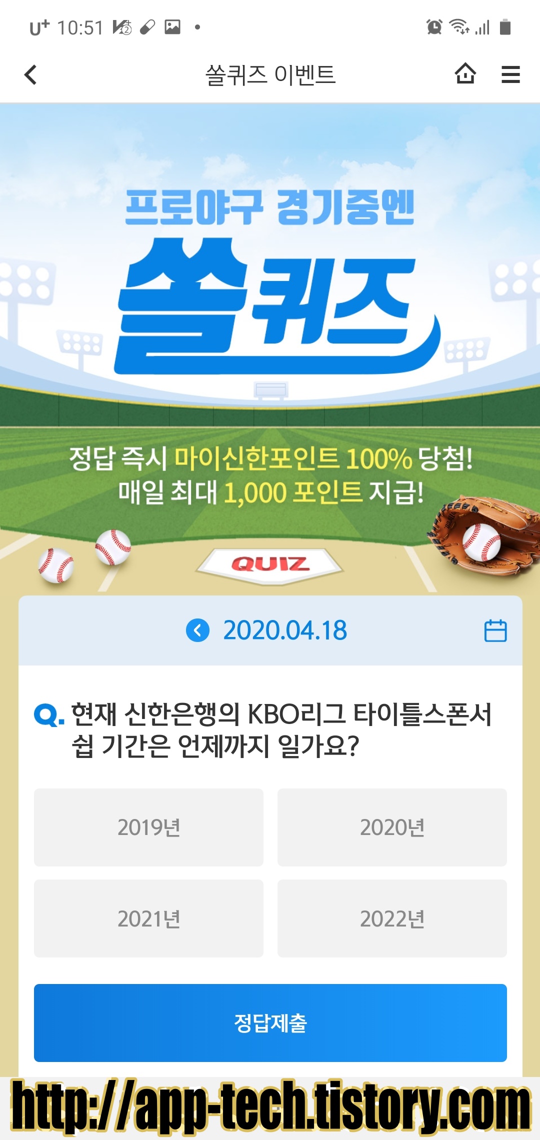 [앱테크] 신한 쏠(SOL) 야구 퀴즈 이벤트!! 4월 17일 (0) | 2020.04.17 |