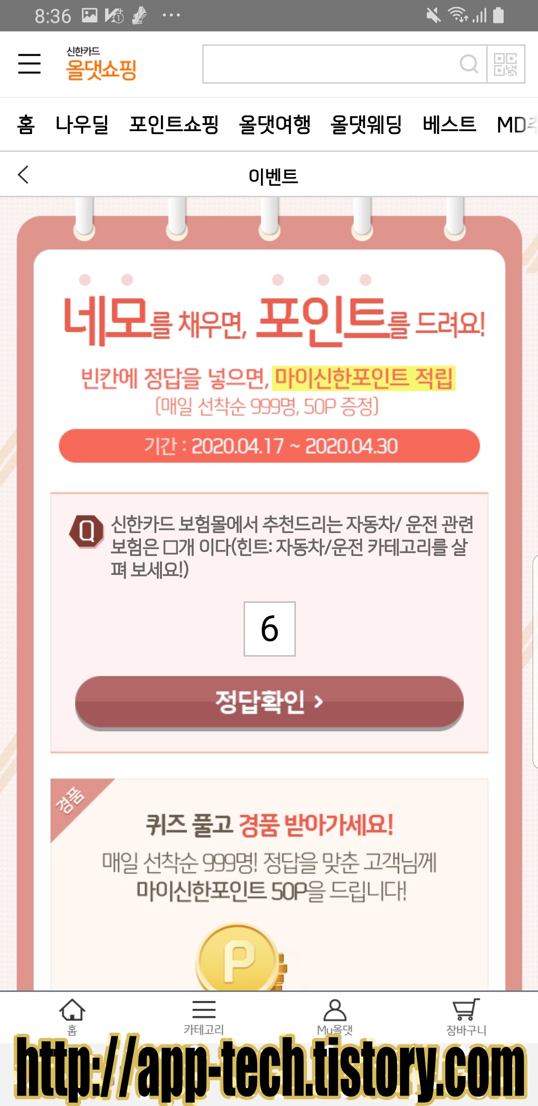 [앱테크] 신한페이판 신박한 퀴즈 이벤트 2탄!! 4월 20일 (0) | 2020.04.20 |